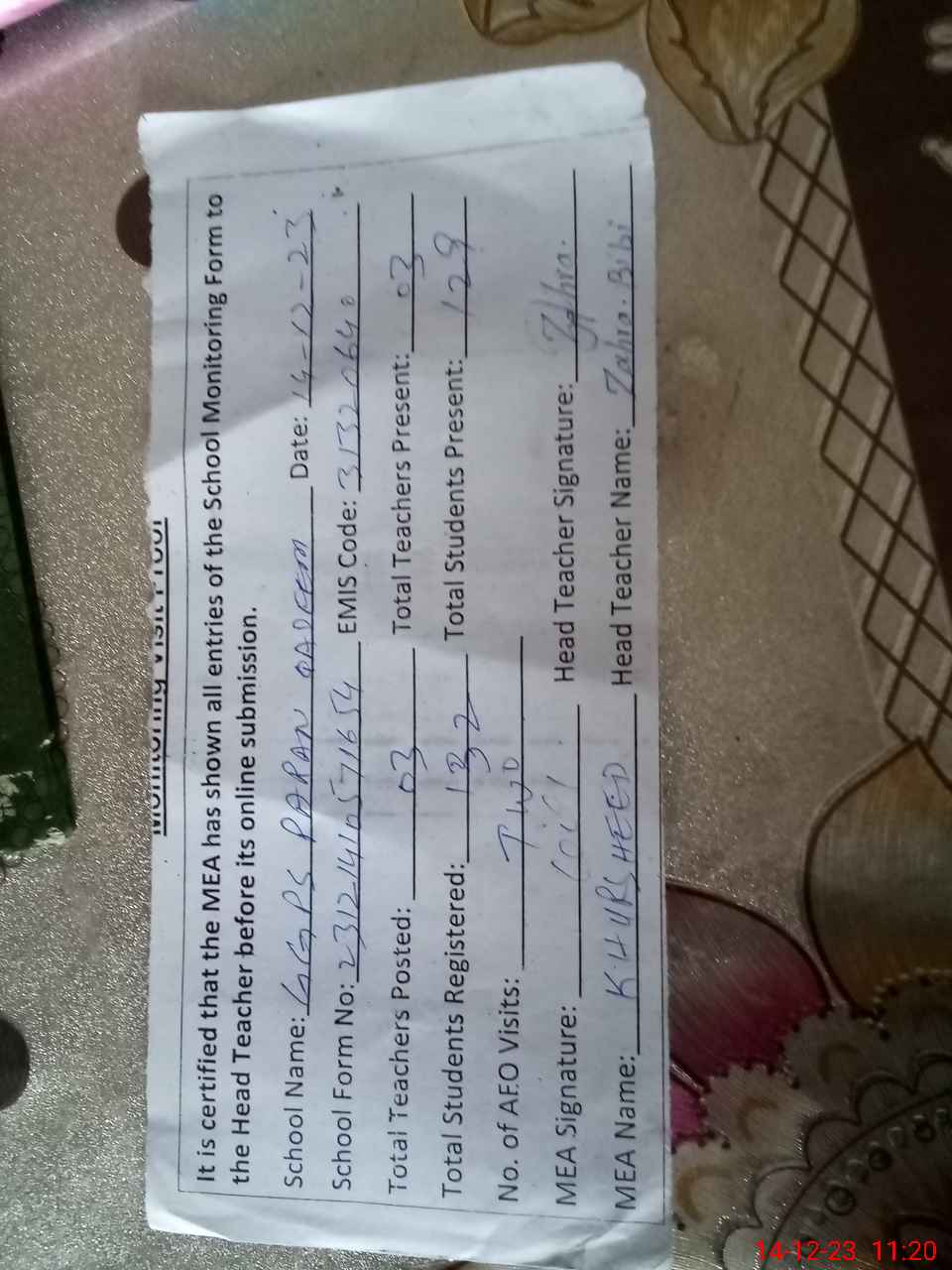 | Attendance Register | Head Teacher | MEA with School | Visit Proof |