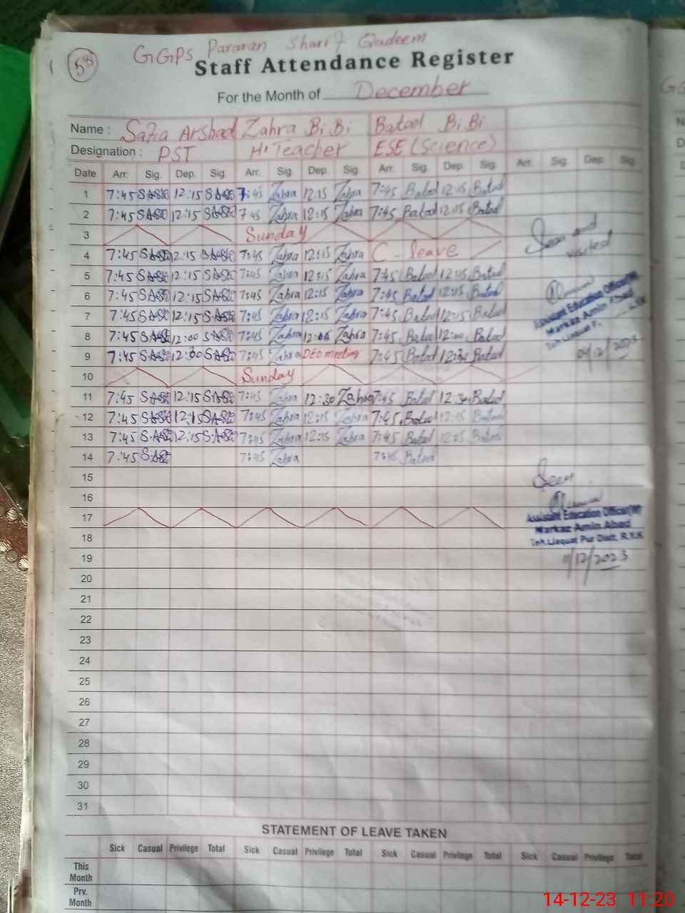 | CNIC | Full Name | Designation | R/C | Absence During Last Calender Month |