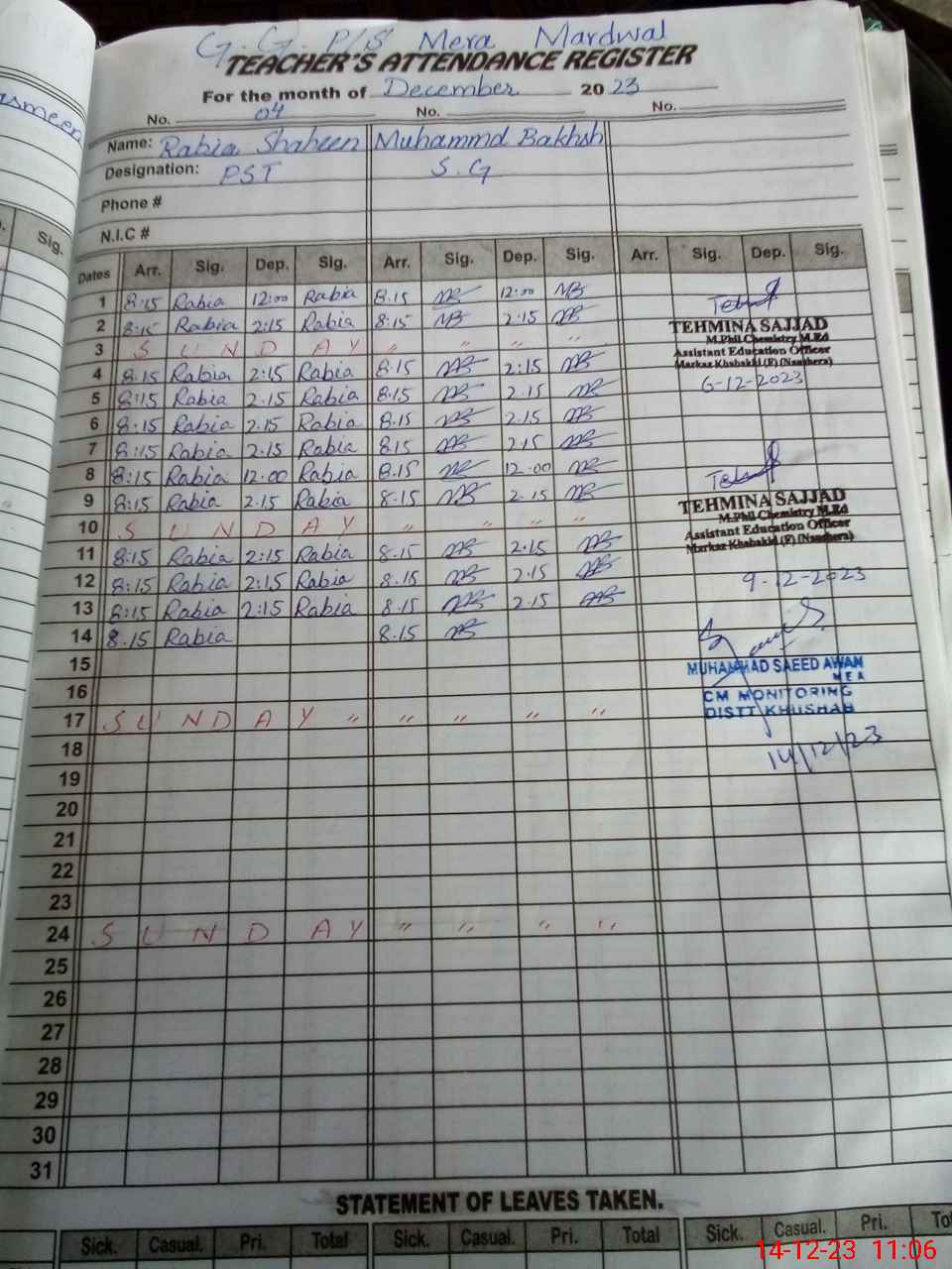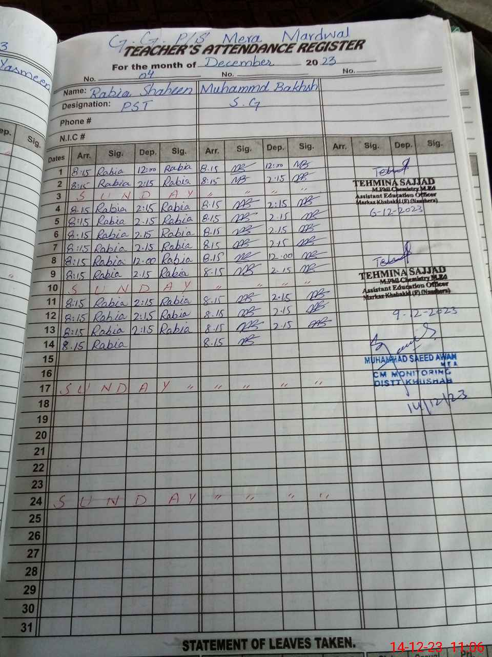 | CNIC | Full Name | Designation | R/C | Absence During Last Calender Month |