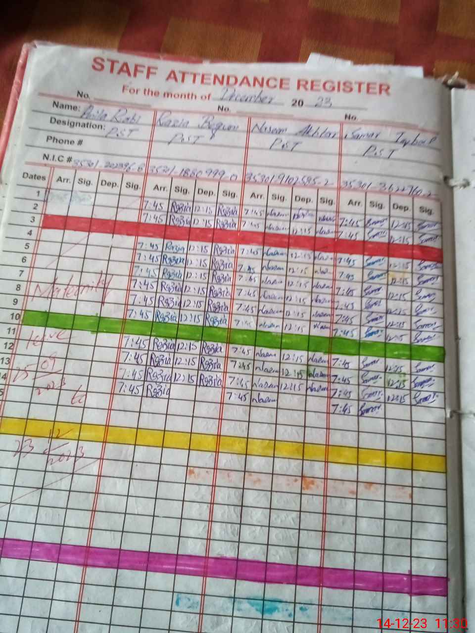 | CNIC | Full Name | Designation | R/C | Absence During Last Calender Month |