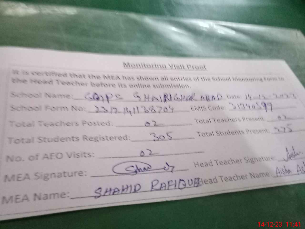 | Attendance Register | Head Teacher | MEA with School | Visit Proof |