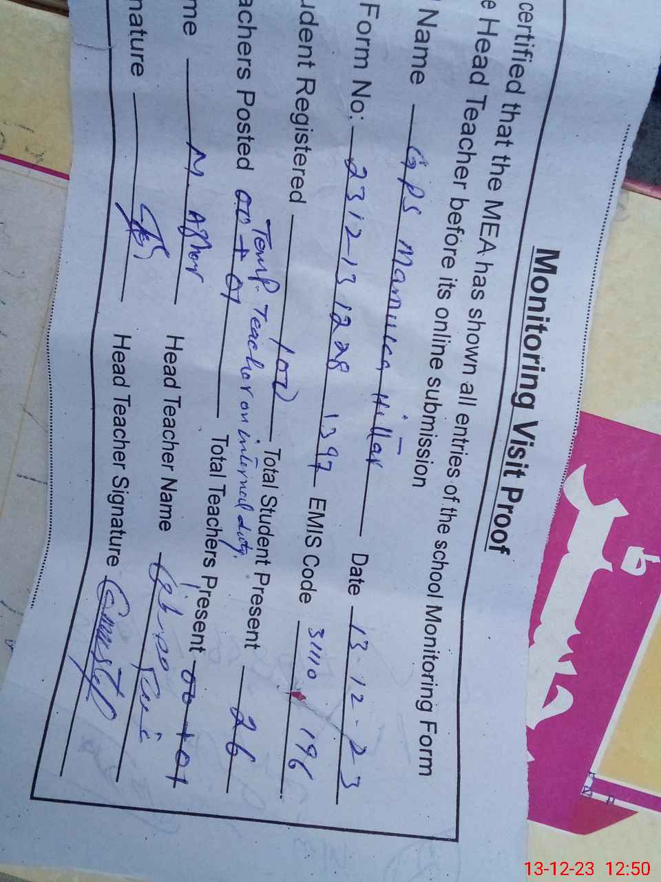 | Attendance Register | Head Teacher | MEA with School | Visit Proof |