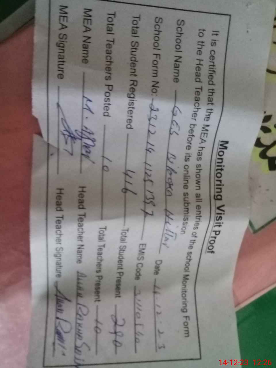 | Attendance Register | Head Teacher | MEA with School | Visit Proof |