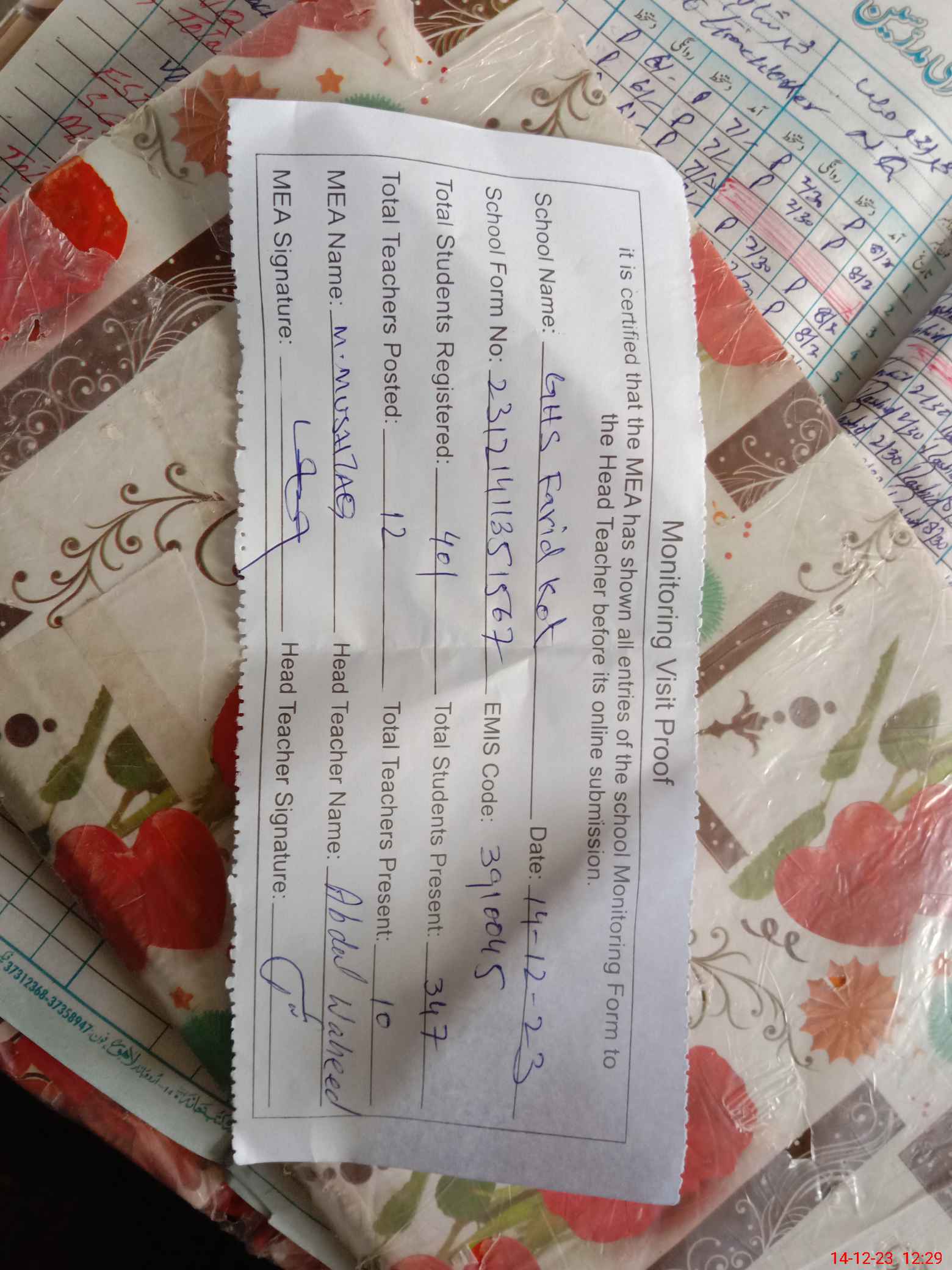 | Attendance Register | Head Teacher | MEA with School | Visit Proof |