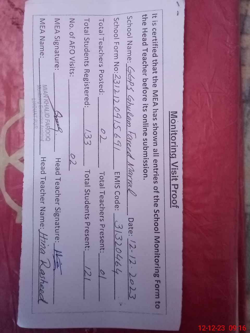 | EMIS Code: 31320464 | Name of School: GGPS GHULAM FAREED MARAL | |||