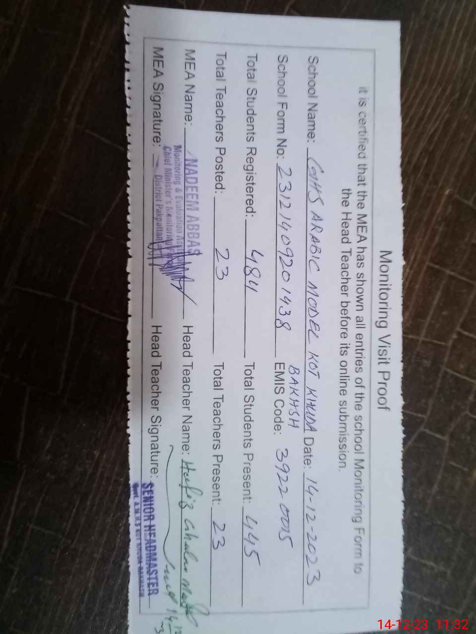 | EMIS Code: 39220015 | Name of School: GHS ARABIC MODEL KOT KHUDA BAKHSH | |||