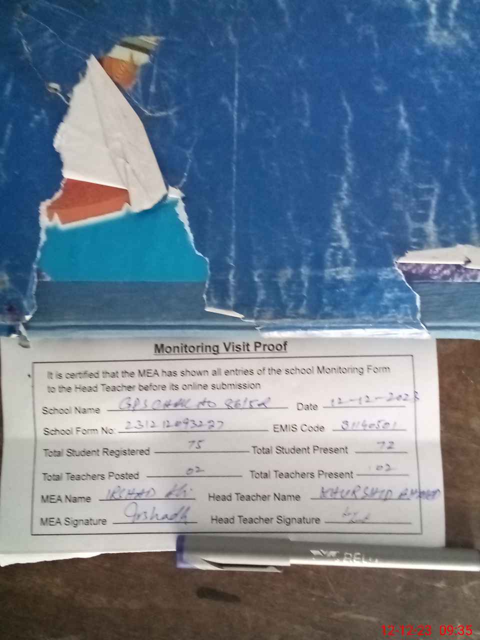 | Attendance Register | Head Teacher | MEA with School | Visit Proof |