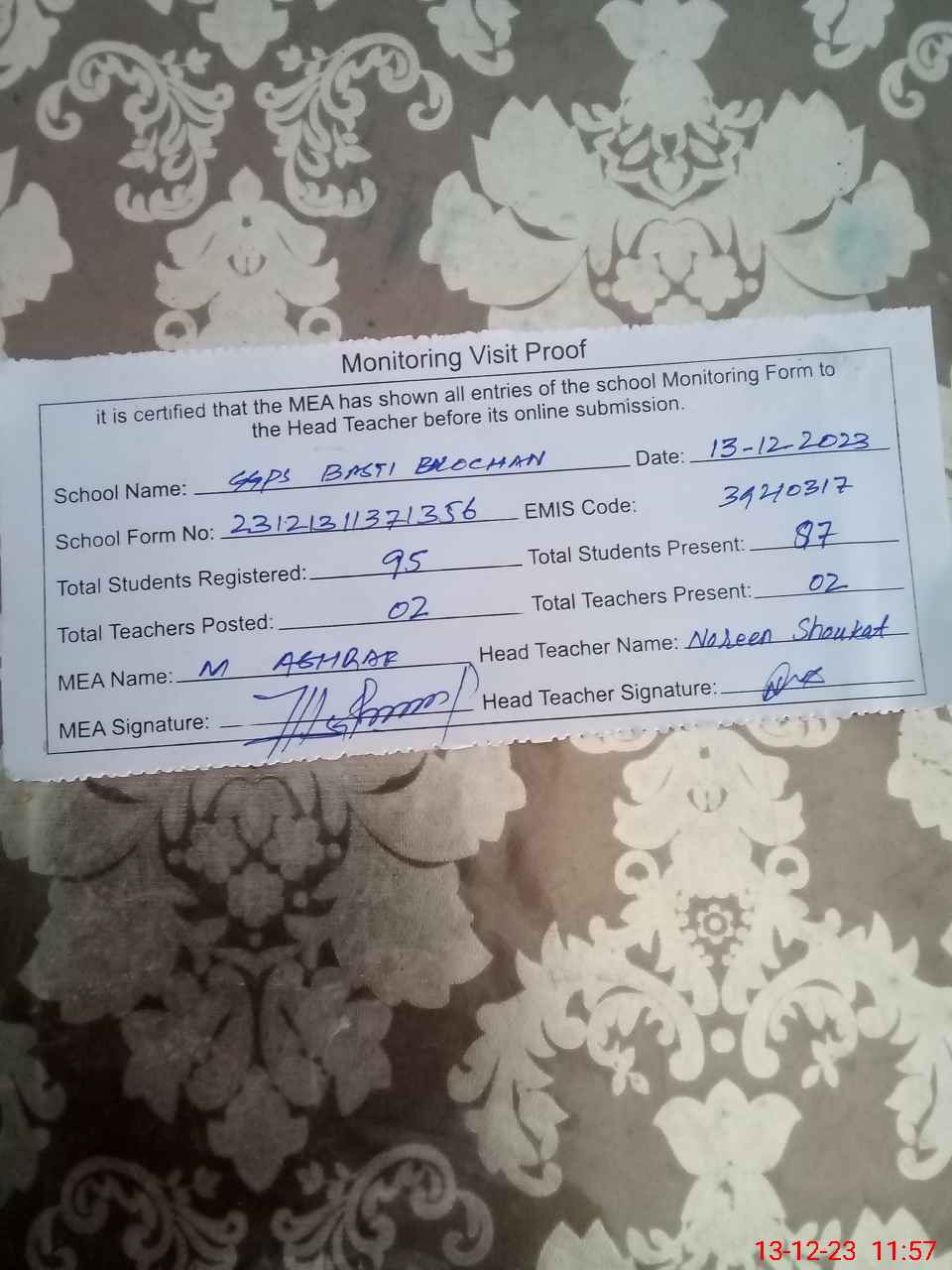 | Attendance Register | Head Teacher | MEA with School | Visit Proof |