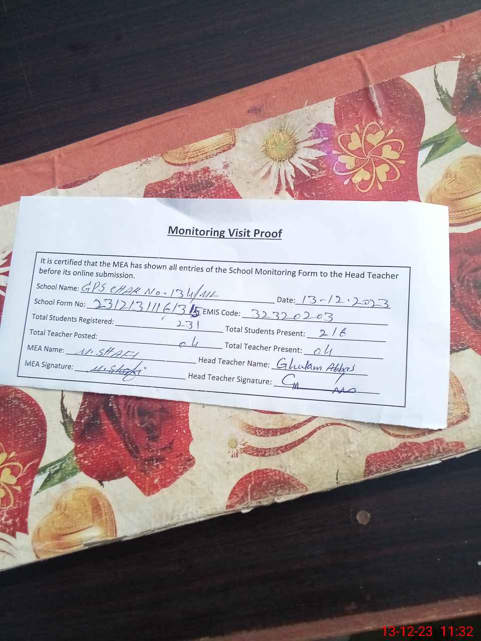 | Attendance Register | Head Teacher | MEA with School | Visit Proof |
