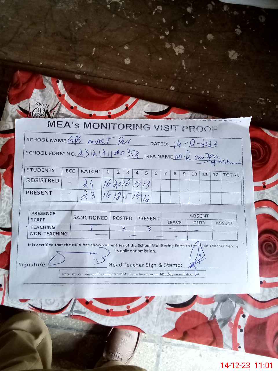 | Attendance Register | Head Teacher | MEA with School | Visit Proof |