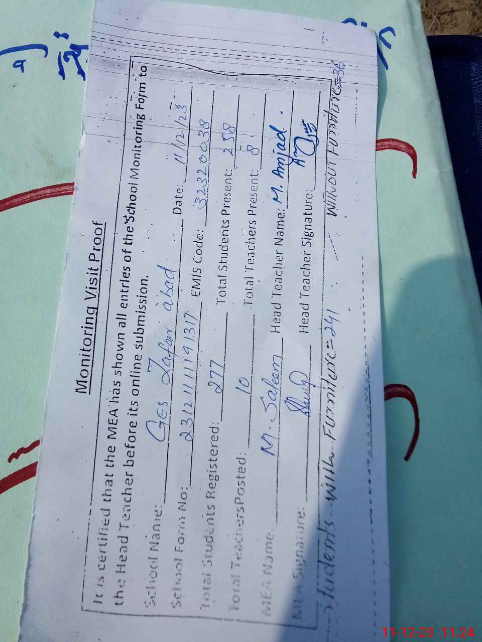 | Attendance Register | Head Teacher | MEA with School | Visit Proof |