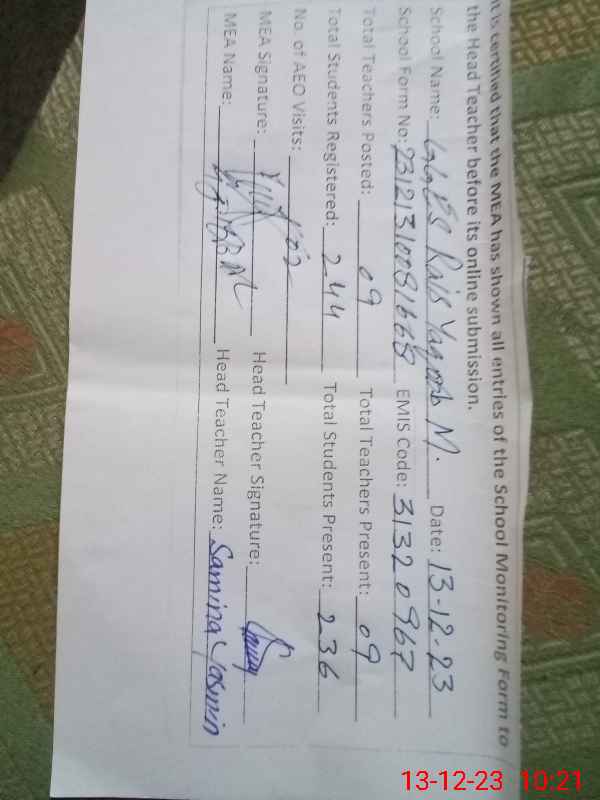 | Attendance Register | Head Teacher | MEA with School | Visit Proof |