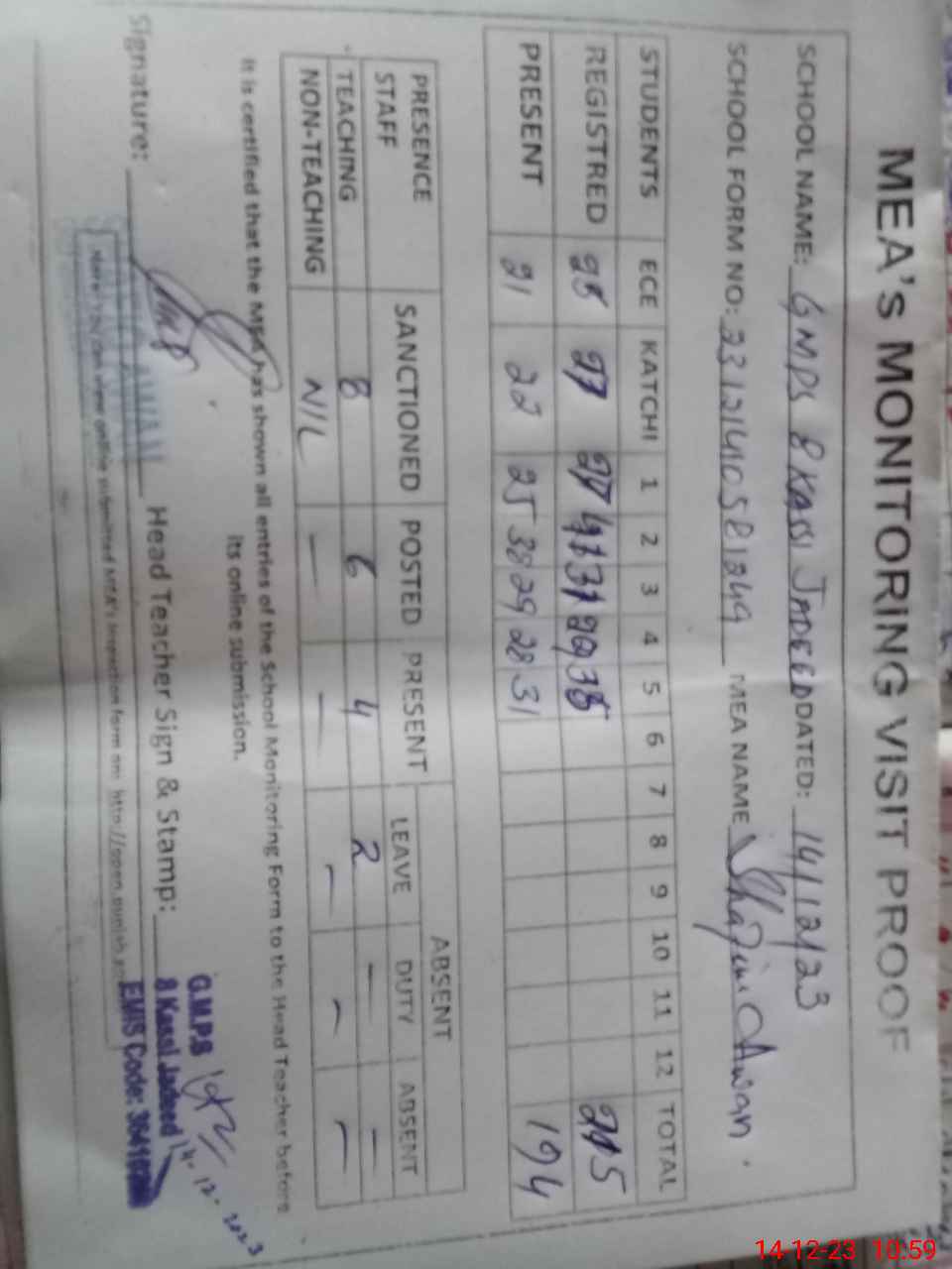 | Attendance Register | Head Teacher | MEA with School | Visit Proof |