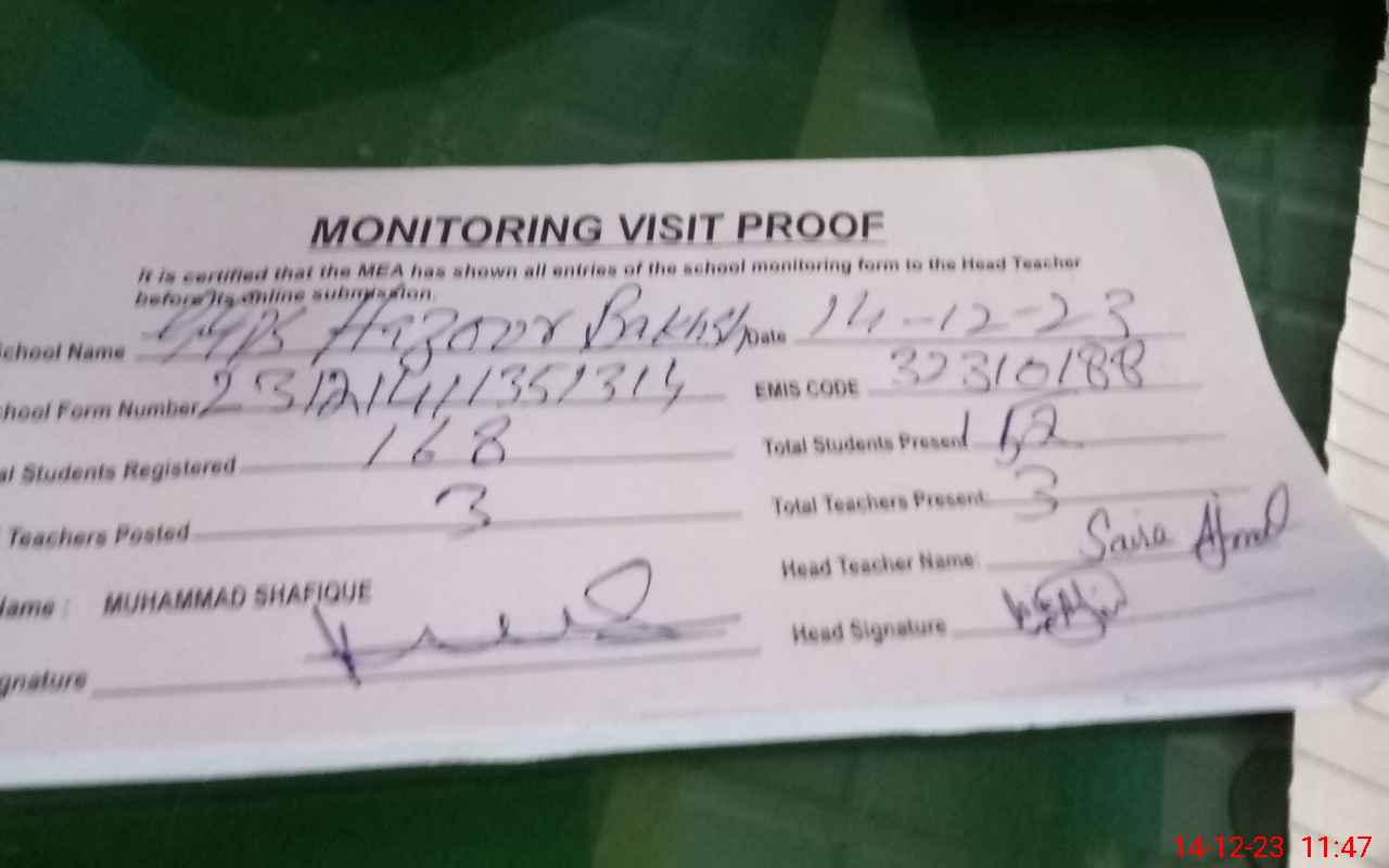 | EMIS Code: 32310188 | Name of School: GGPS HAZOOR BAKHSH | |||