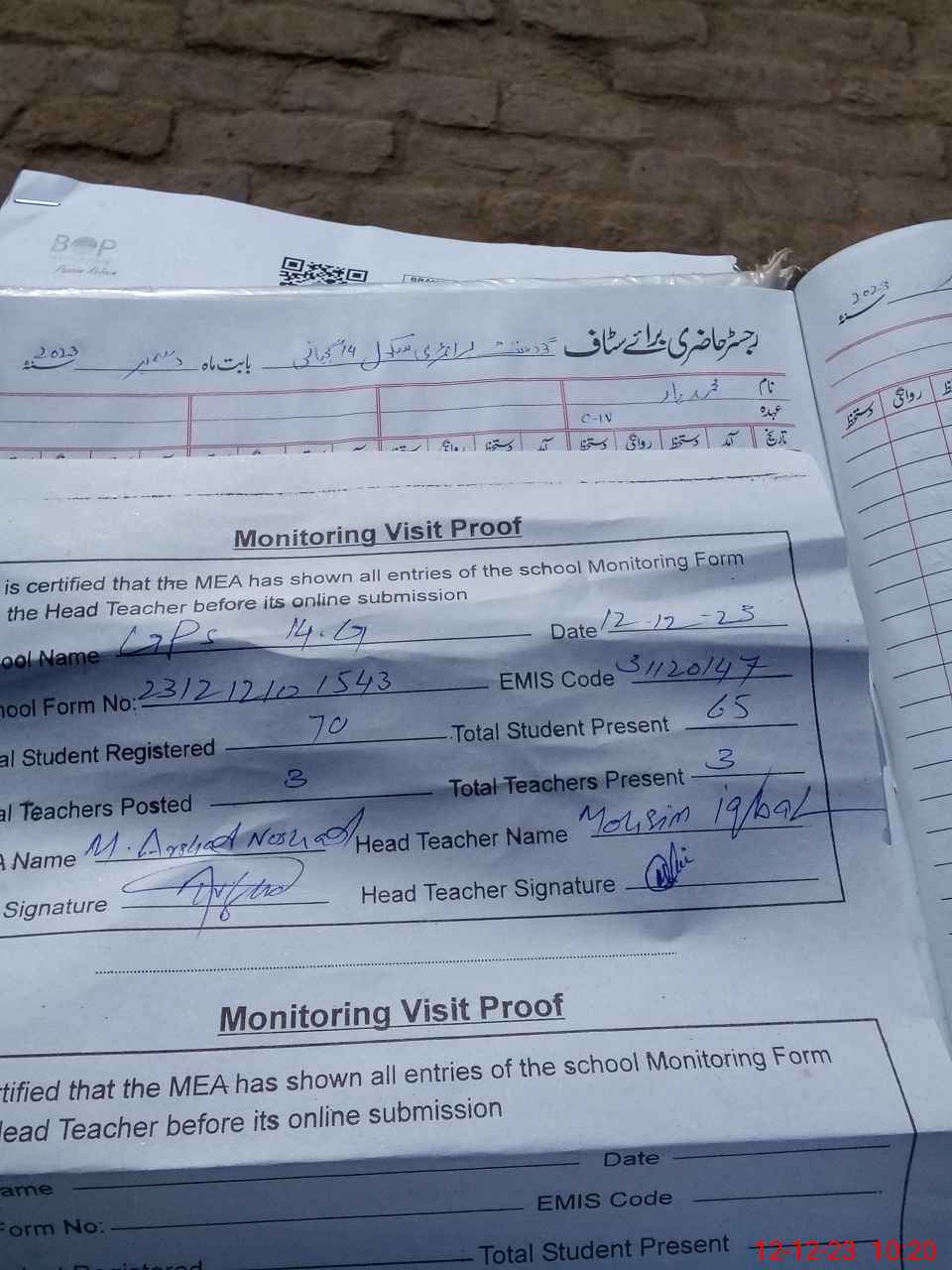 | Attendance Register | Head Teacher | MEA with School | Visit Proof |