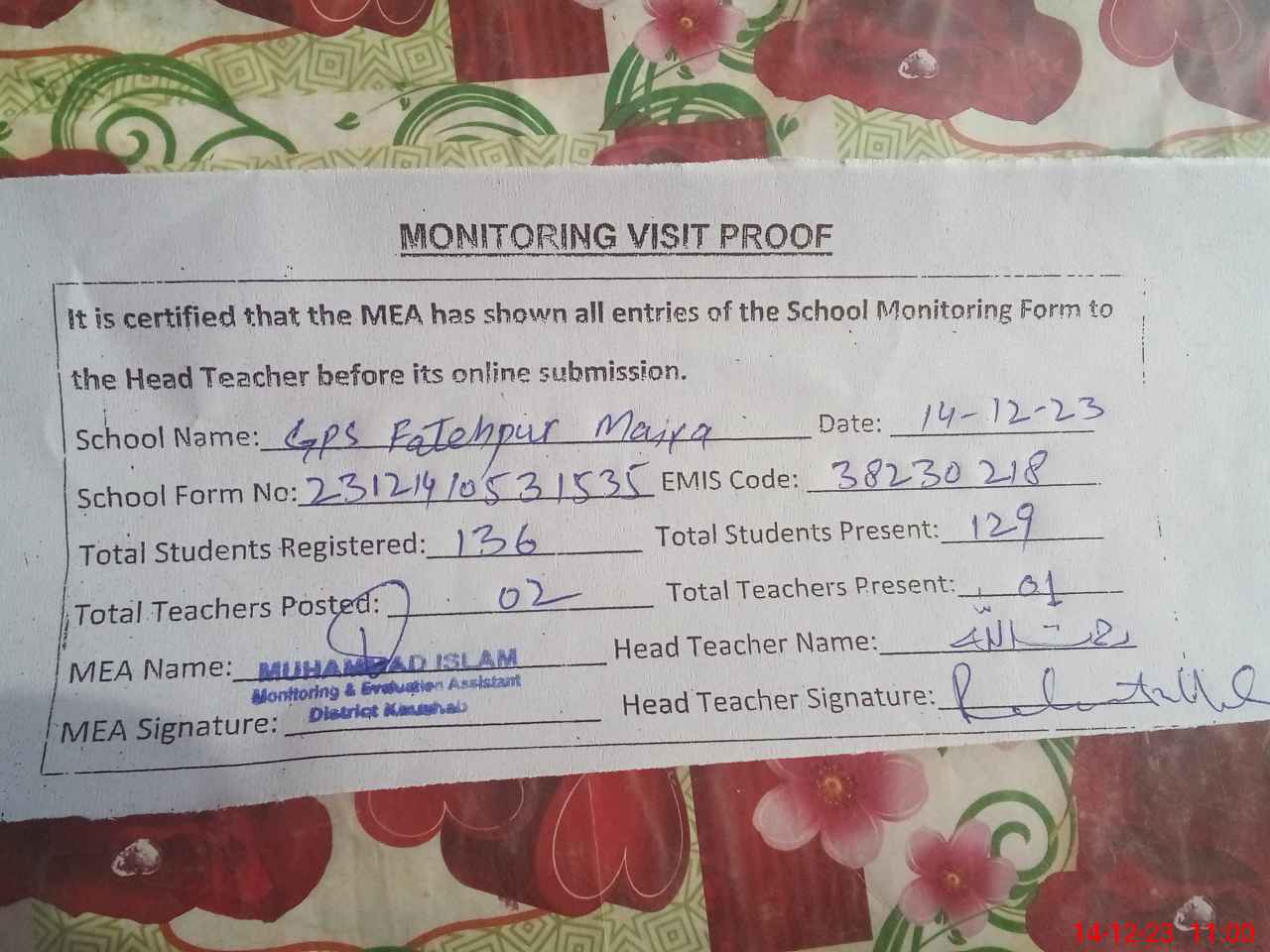 | EMIS Code: 38230218 | Name of School: GPS FATEHPUR MAIRA | |||