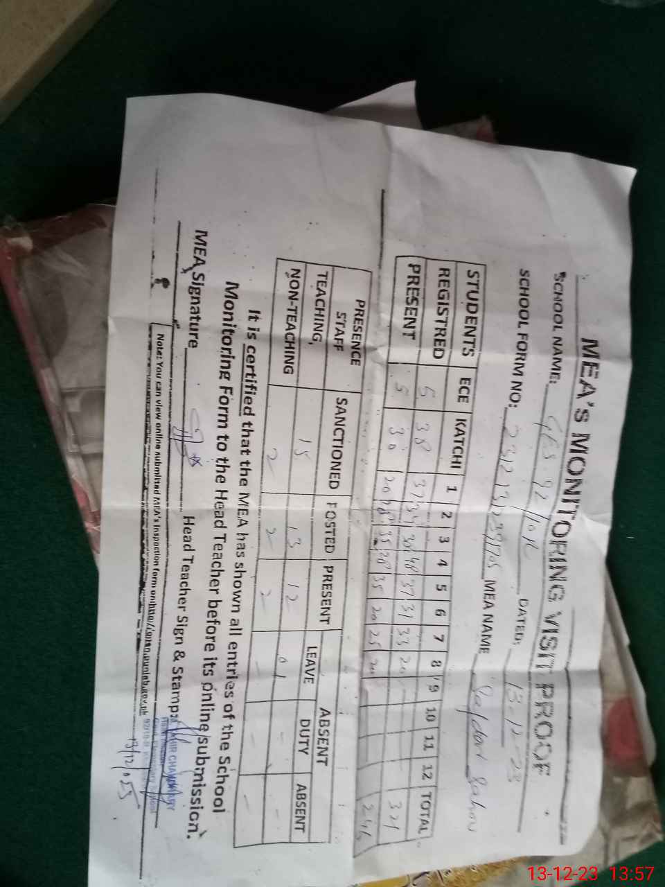 | Attendance Register | Head Teacher | MEA with School | Visit Proof |