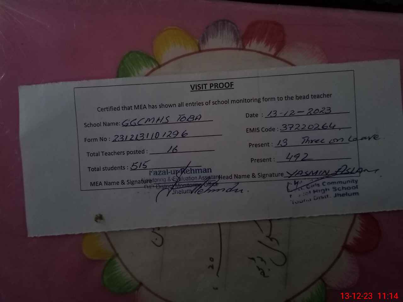 | Attendance Register | Head Teacher | MEA with School | Visit Proof |