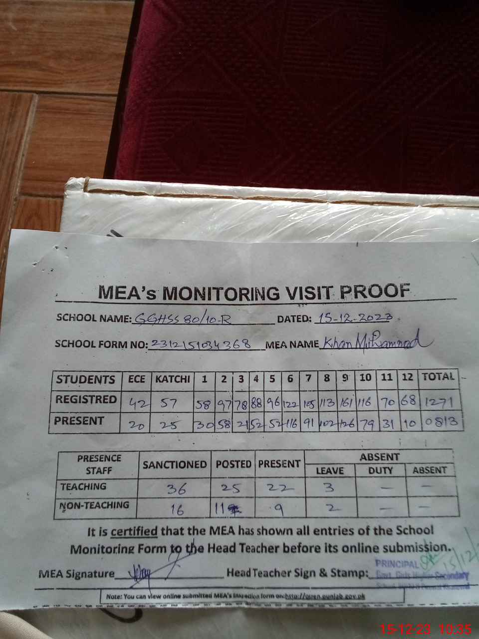 | Attendance Register | Head Teacher | MEA with School | Visit Proof |