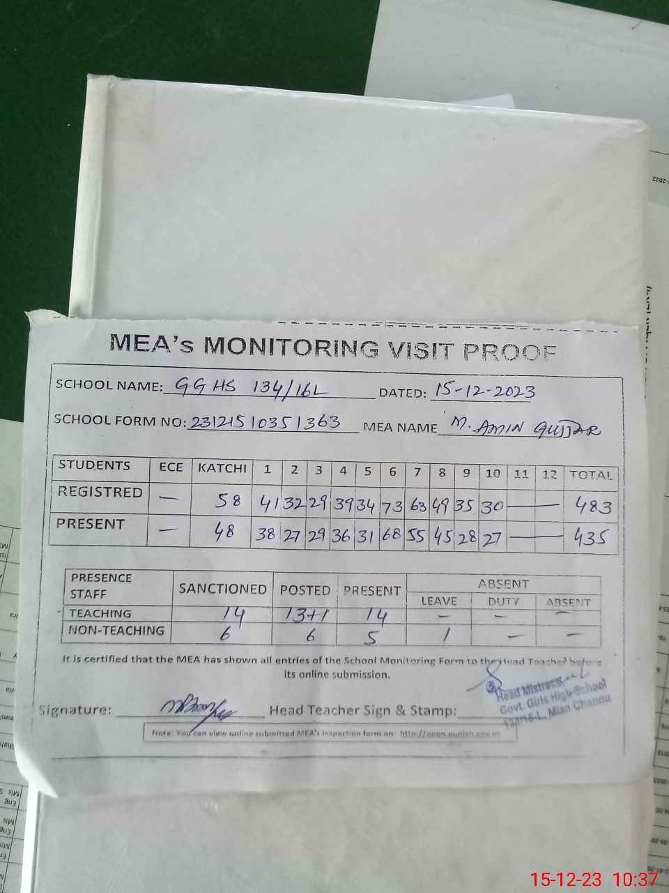 | EMIS Code: 36430079 | Name of School: GGHS 134/16-L, MIAN CHANNU | |||
