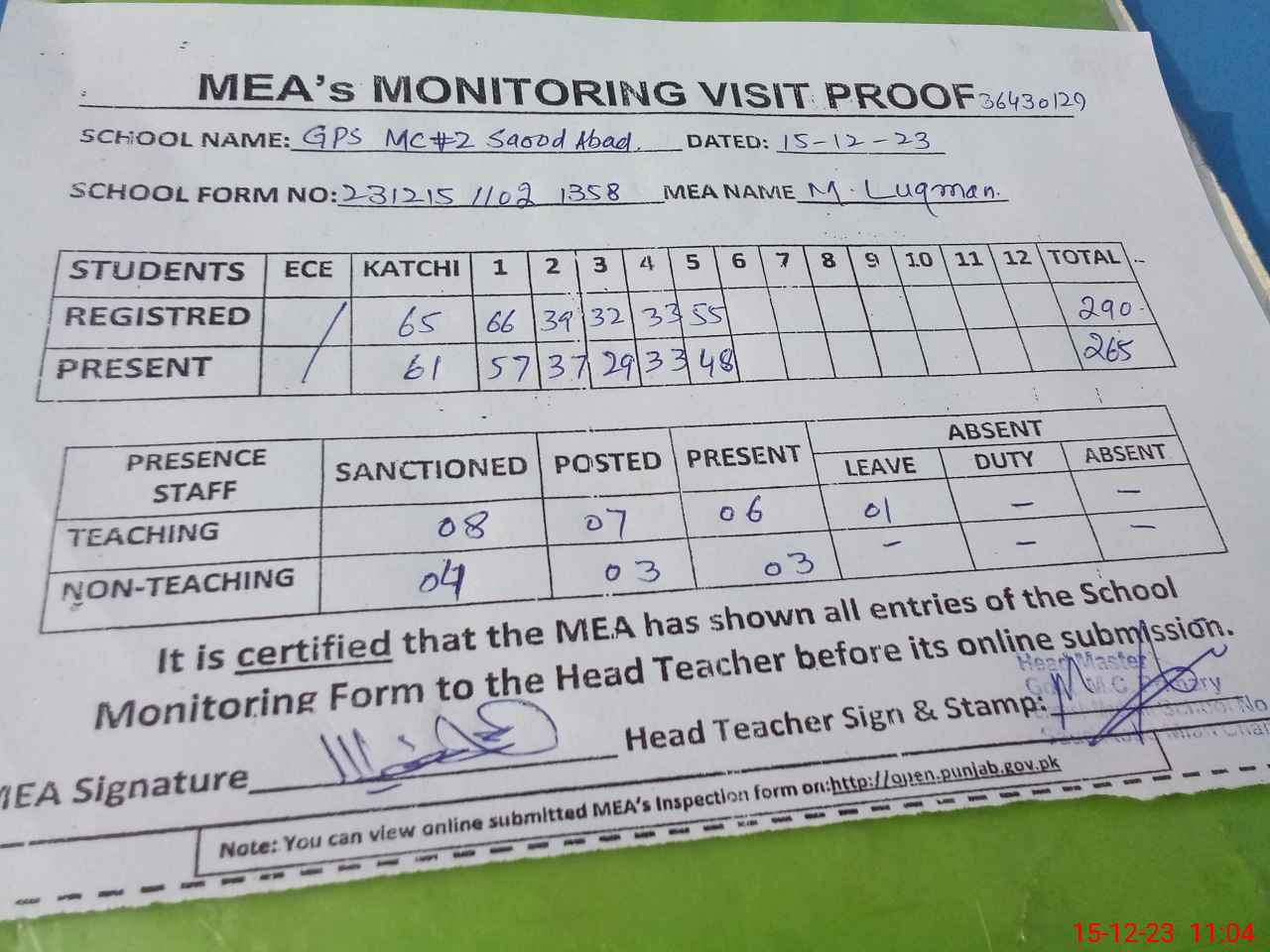| Attendance Register | Head Teacher | MEA with School | Visit Proof |