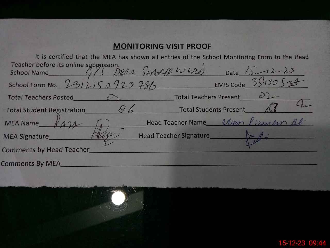 | Attendance Register | Head Teacher | MEA with School | Visit Proof |