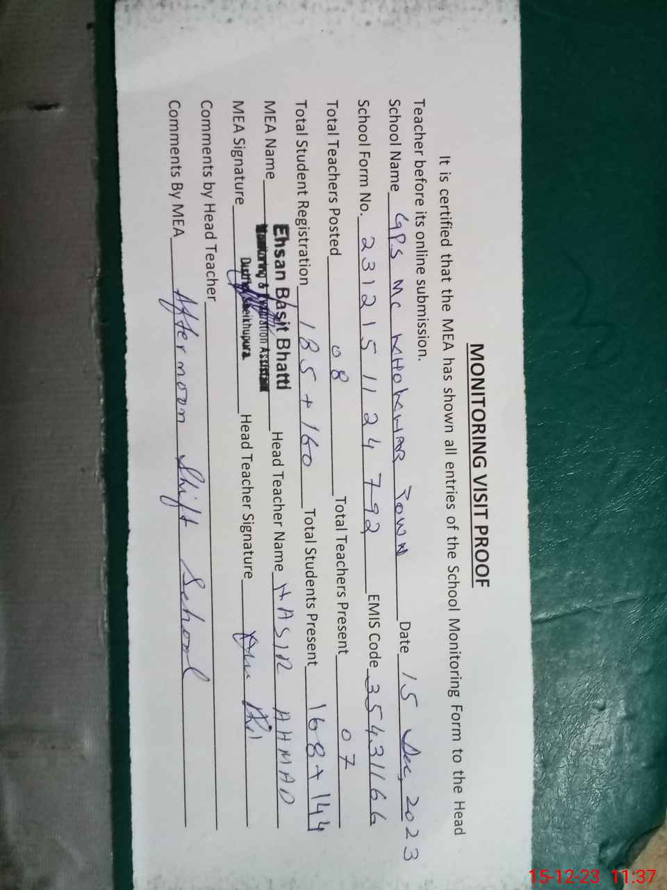 | Attendance Register | Head Teacher | MEA with School | Visit Proof |