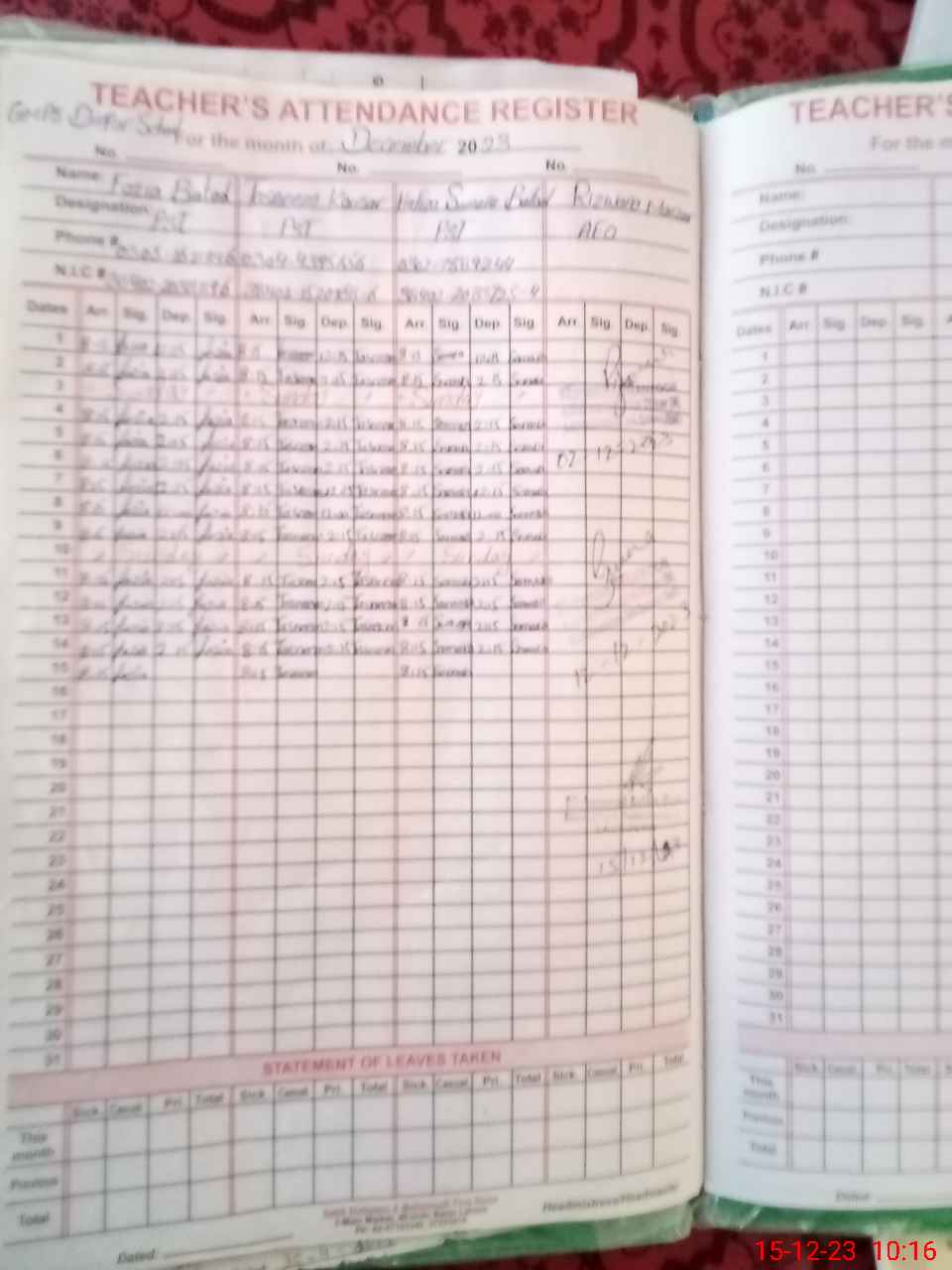 | CNIC | Full Name | Designation | R/C | Absence During Last Calender Month |