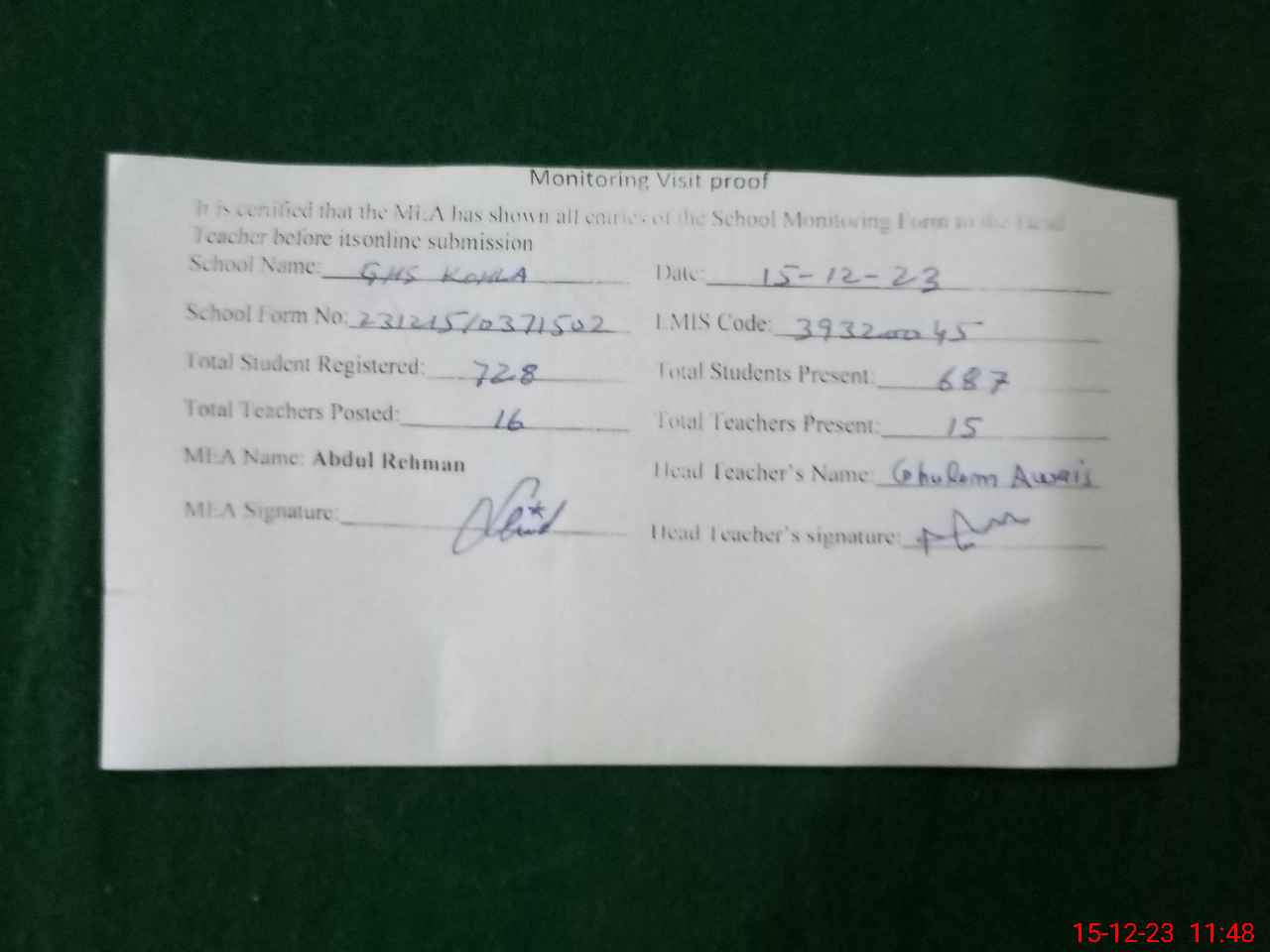 | EMIS Code: 39320045 | Name of School: GHS KOHLA | |||