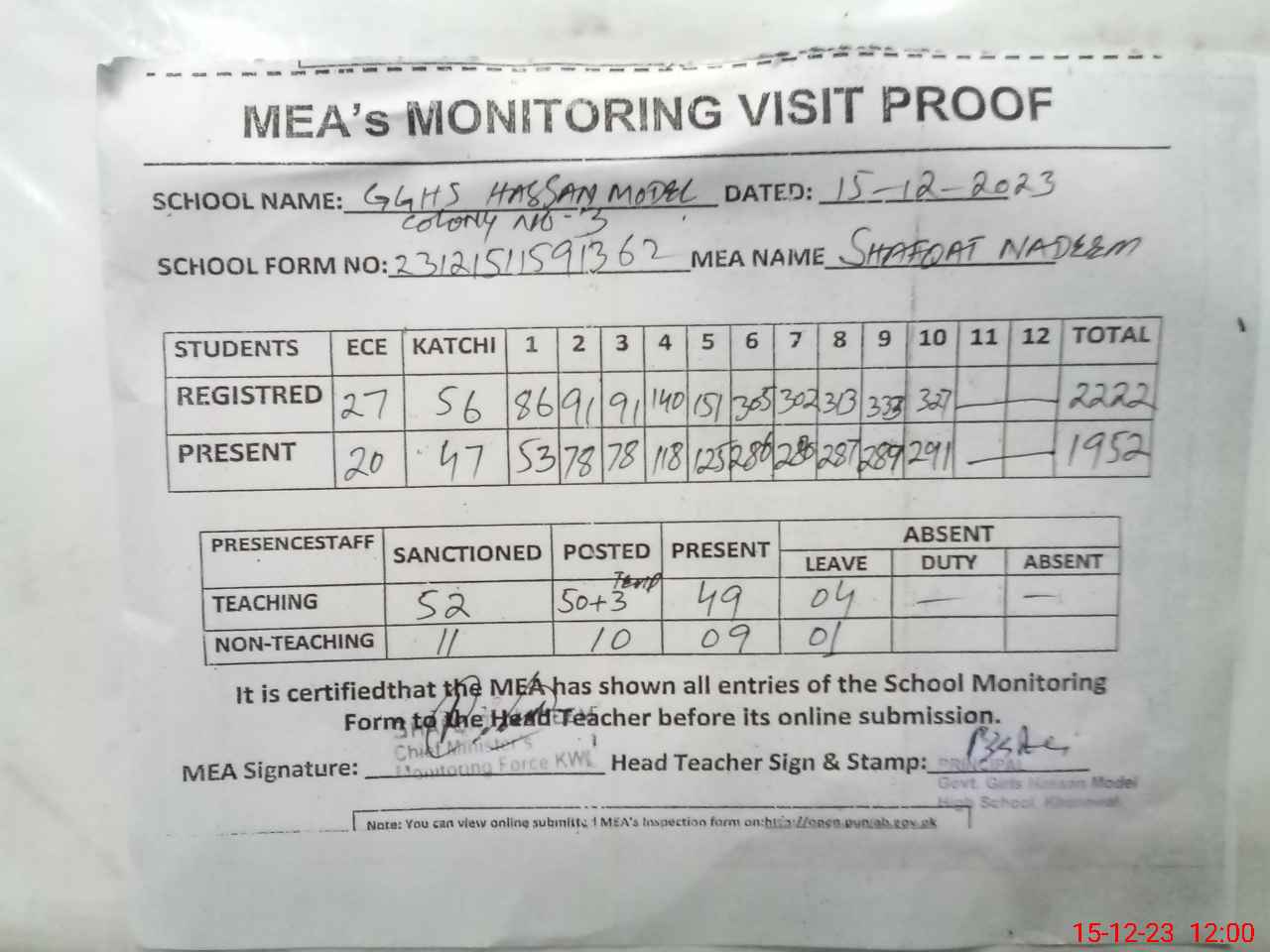 | EMIS Code: 36420043 | Name of School: GGHS HASSAN MODEL, COLONY NO.3 KHANEWAL | |||