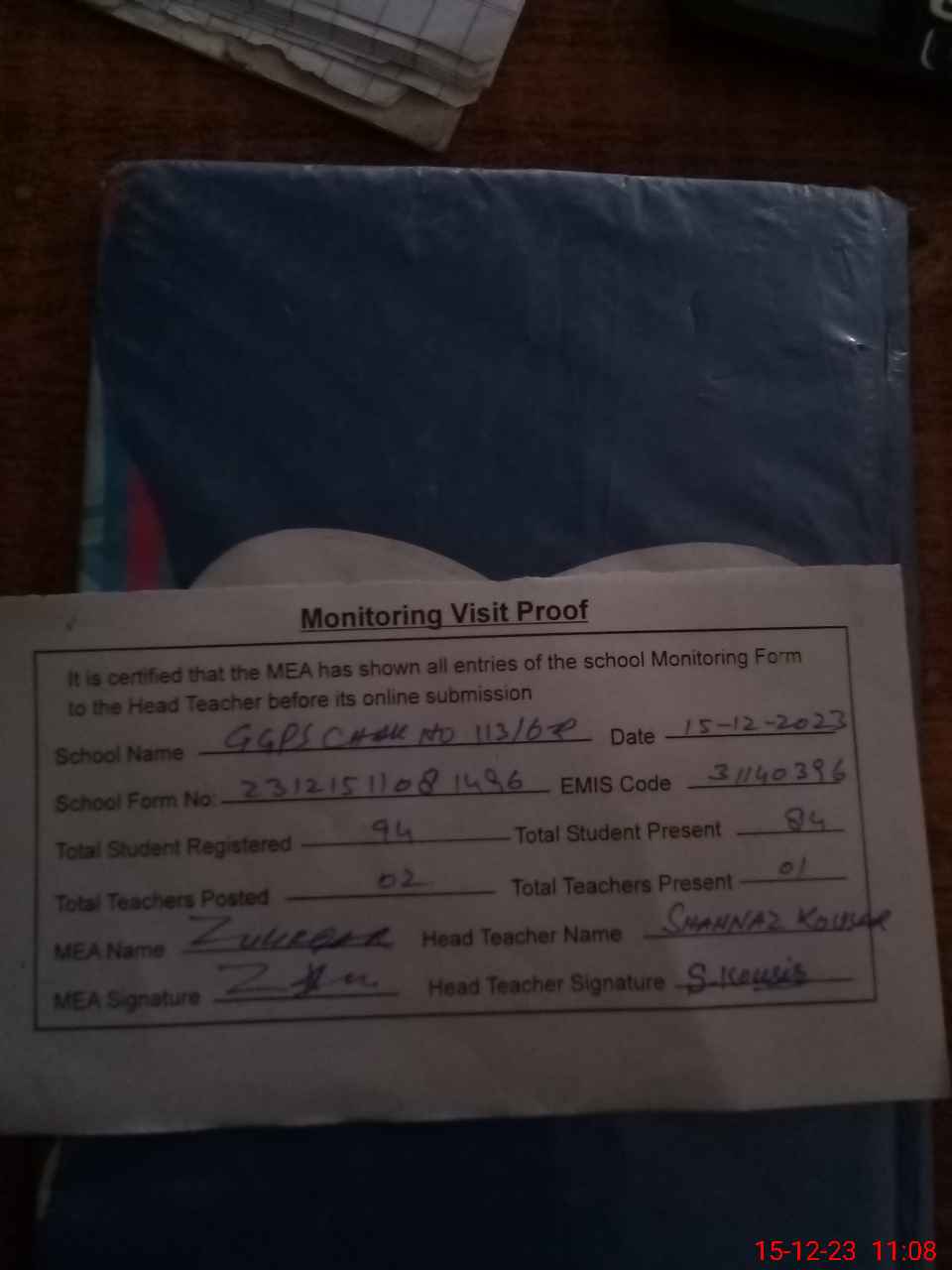 | Attendance Register | Head Teacher | MEA with School | Visit Proof |