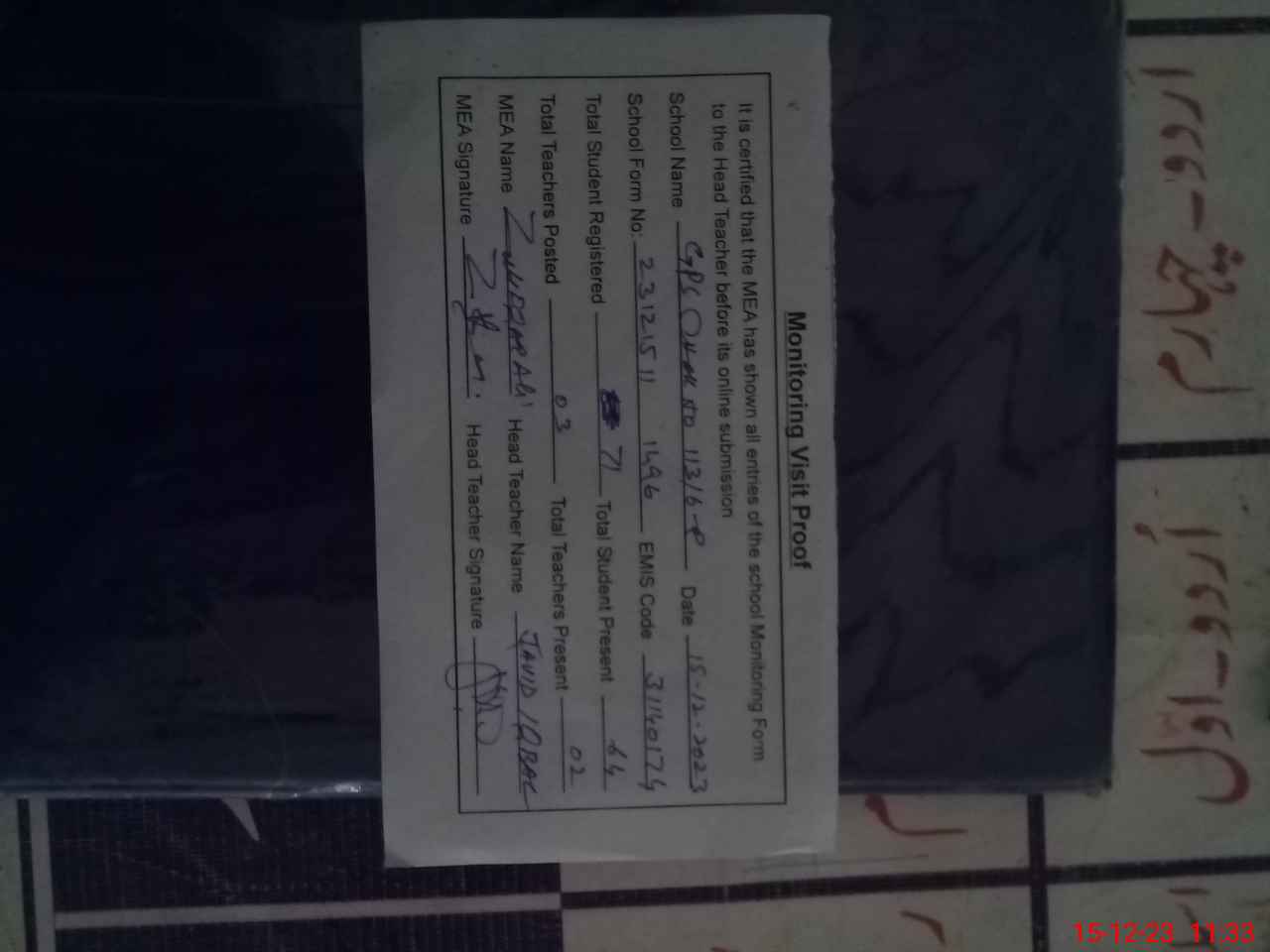 | Attendance Register | Head Teacher | MEA with School | Visit Proof |