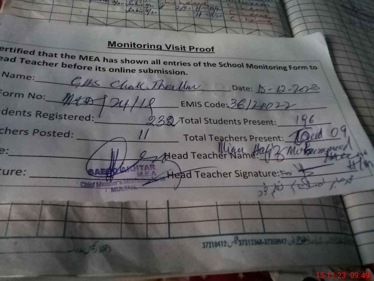 | Attendance Register | Head Teacher | MEA with School | Visit Proof |