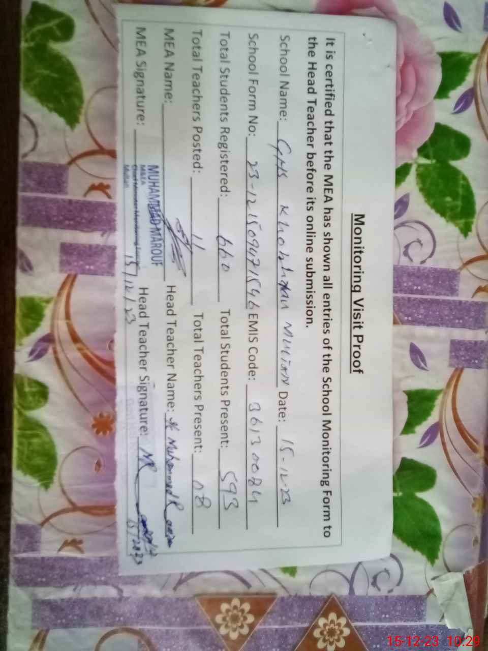 | Attendance Register | Head Teacher | MEA with School | Visit Proof |