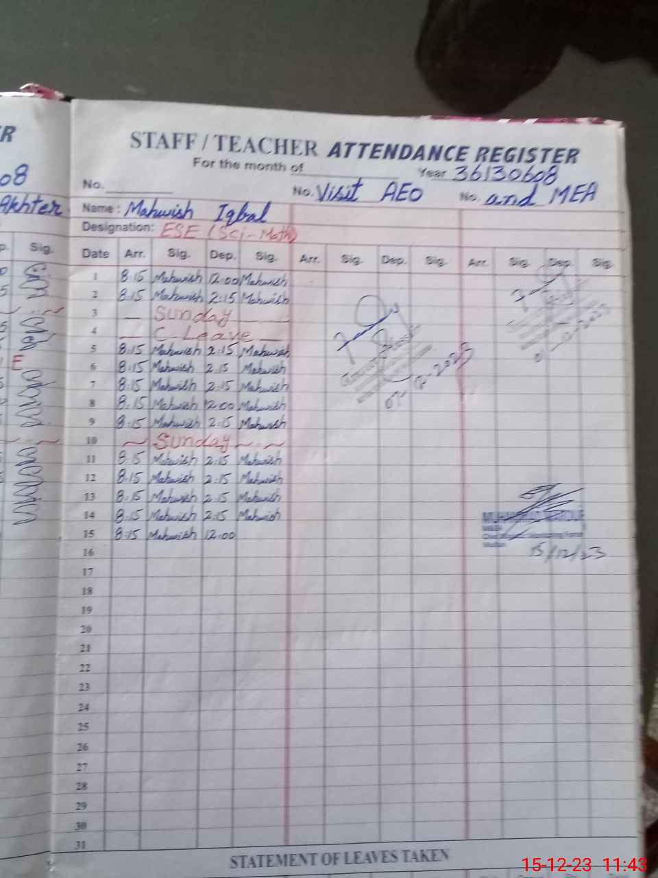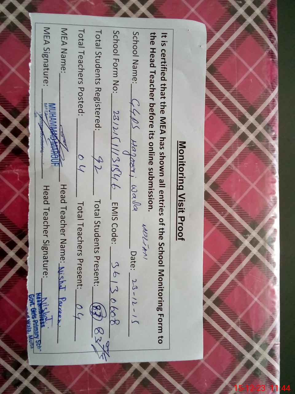| Attendance Register | Head Teacher | MEA with School | Visit Proof |