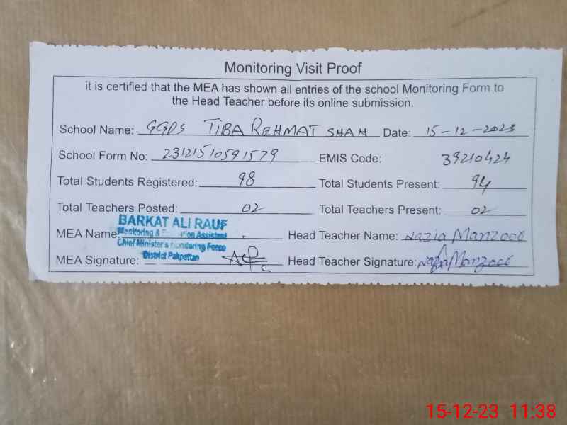 | EMIS Code: 39210424 | Name of School: GGPS TIBA REHMAT SHAH | |||