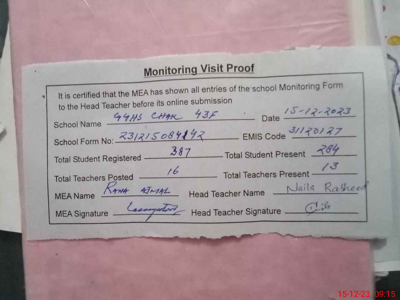 | Attendance Register | Head Teacher | MEA with School | Visit Proof |