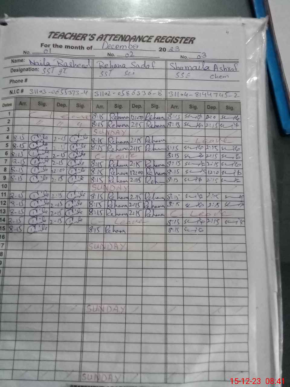 | CNIC | Full Name | Designation | R/C | Absence During Last Calender Month |