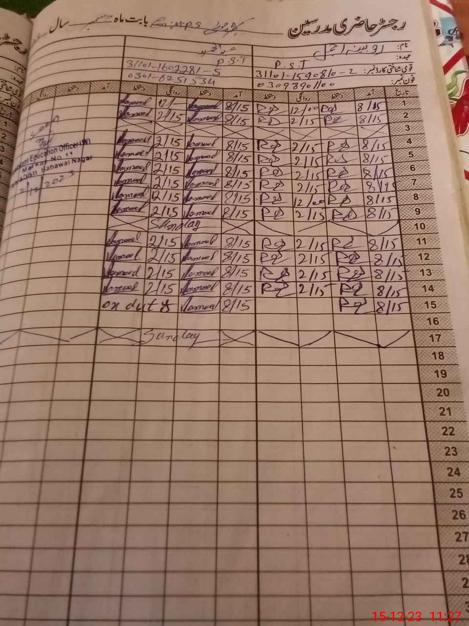 | CNIC | Full Name | Designation | R/C | Absence During Last Calender Month |