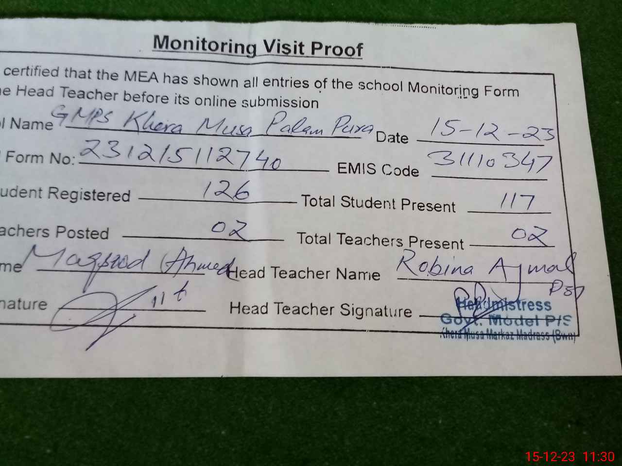 | Attendance Register | Head Teacher | MEA with School | Visit Proof |