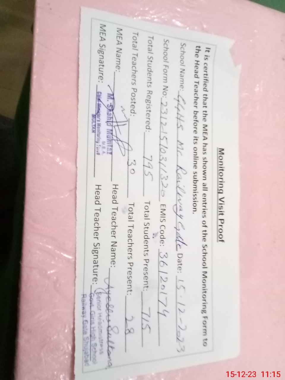 | EMIS Code: 36120174 | Name of School: GGHS MC RAILWAY GATE SHUJABAD | |||