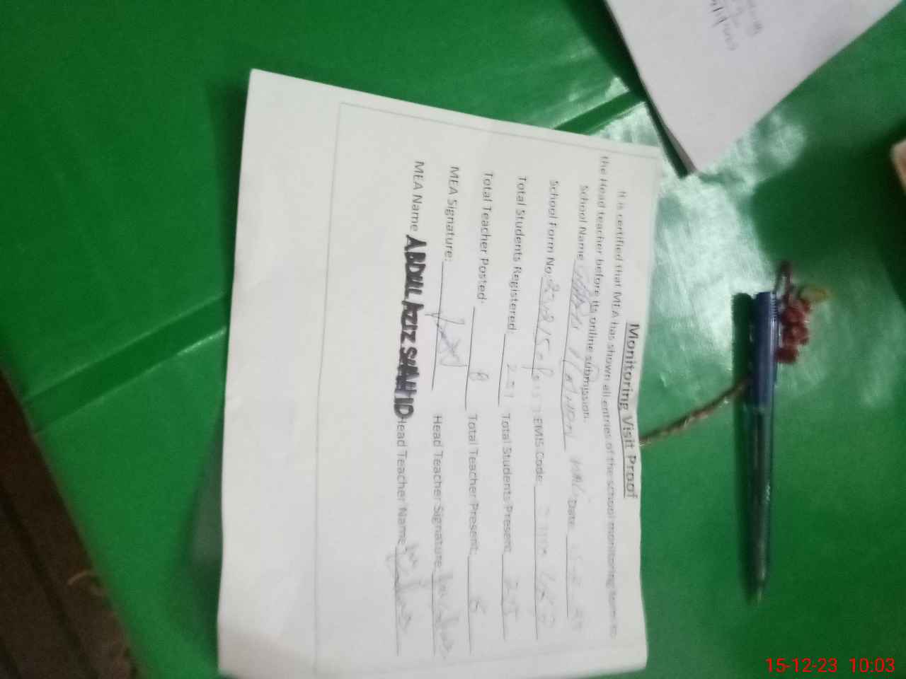 | Attendance Register | Head Teacher | MEA with School | Visit Proof |
