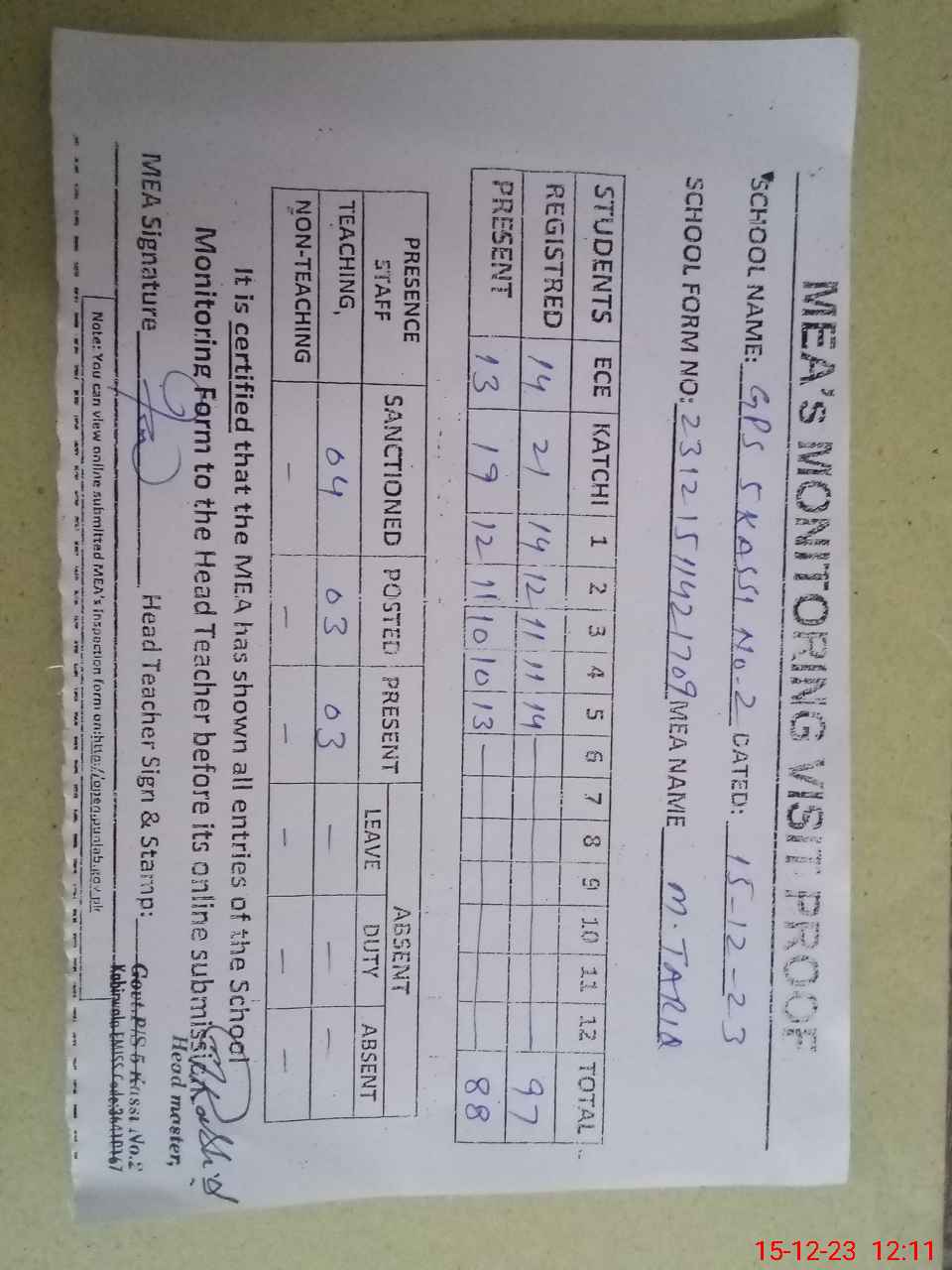 | Attendance Register | Head Teacher | MEA with School | Visit Proof |