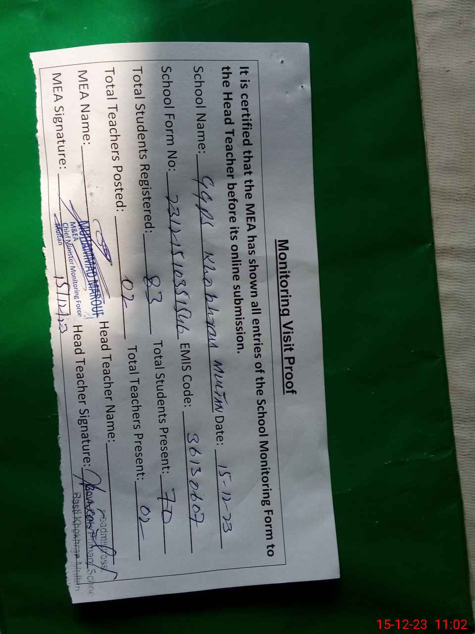 | Attendance Register | Head Teacher | MEA with School | Visit Proof |