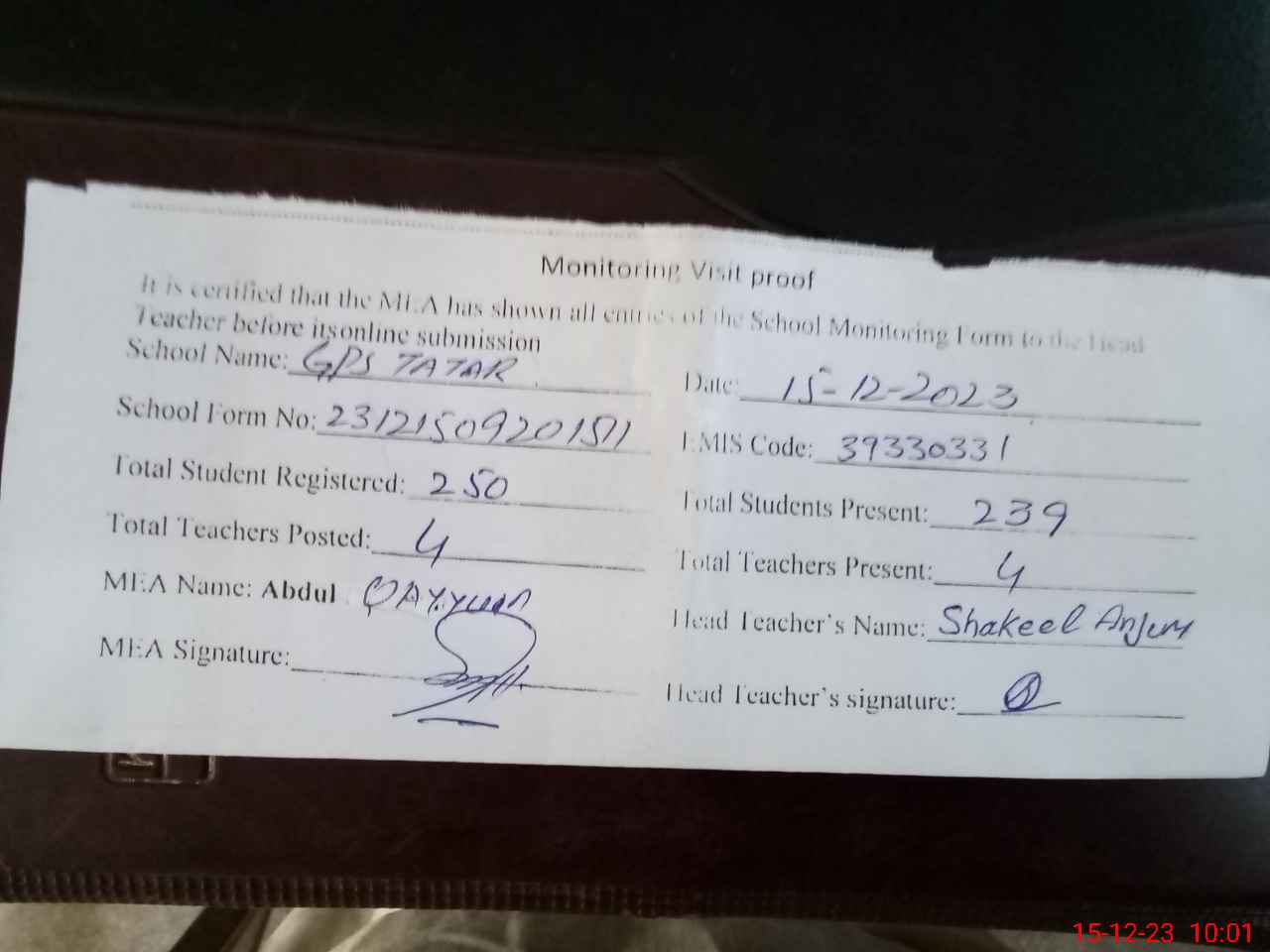 | Attendance Register | Head Teacher | MEA with School | Visit Proof |
