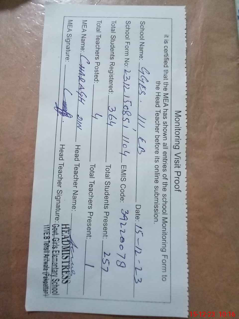 | Attendance Register | Head Teacher | MEA with School | Visit Proof |
