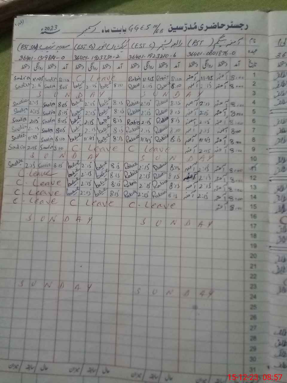 | CNIC | Full Name | Designation | R/C | Absence During Last Calender Month |