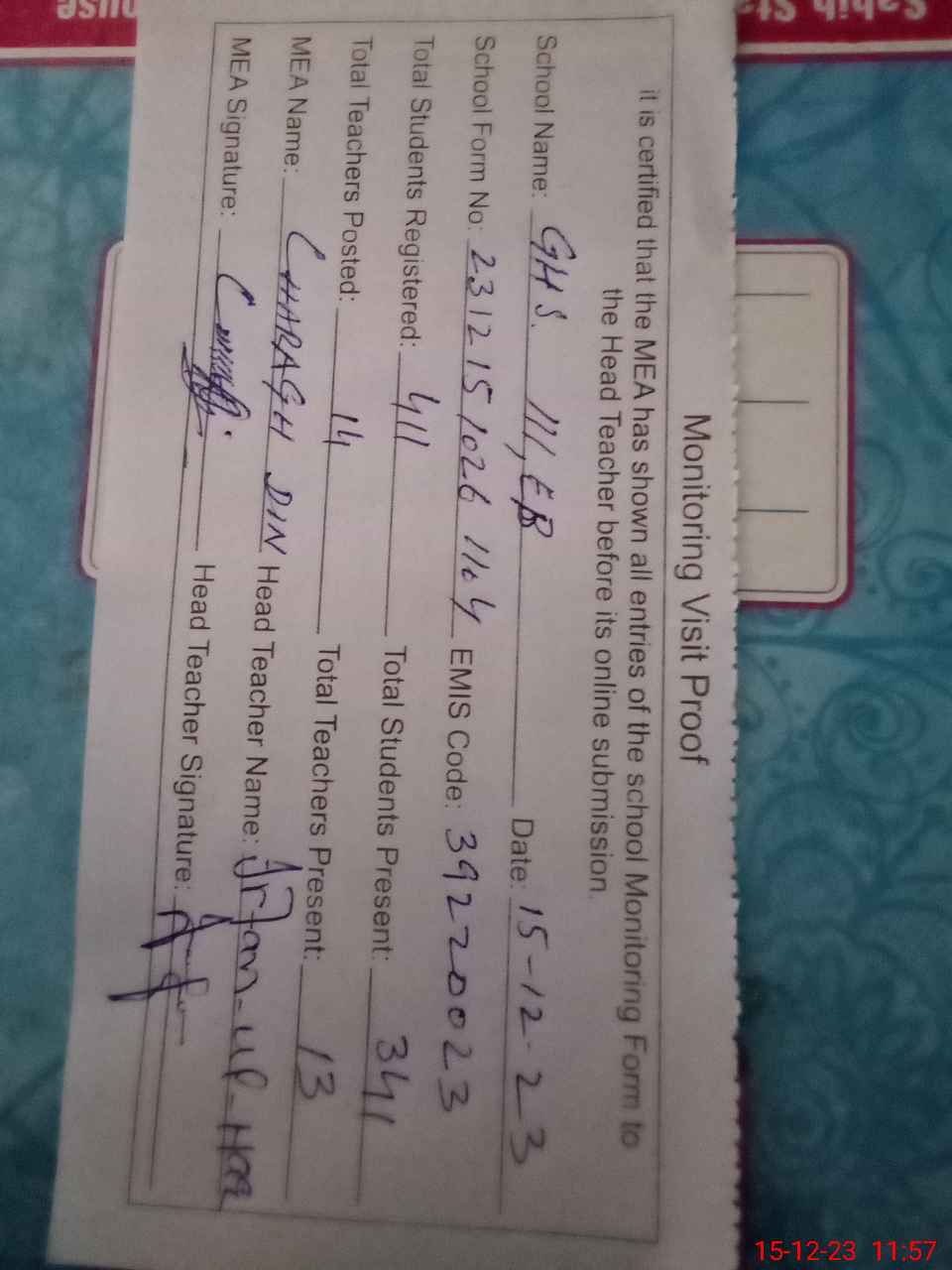 | Attendance Register | Head Teacher | MEA with School | Visit Proof |