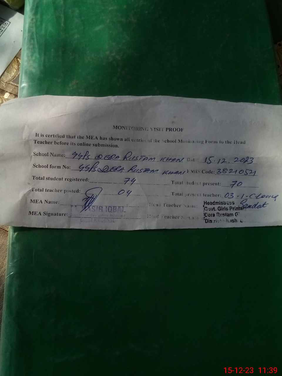 | EMIS Code: 38210521 | Name of School: GGPS DERA RUSTAM KHAN | |||