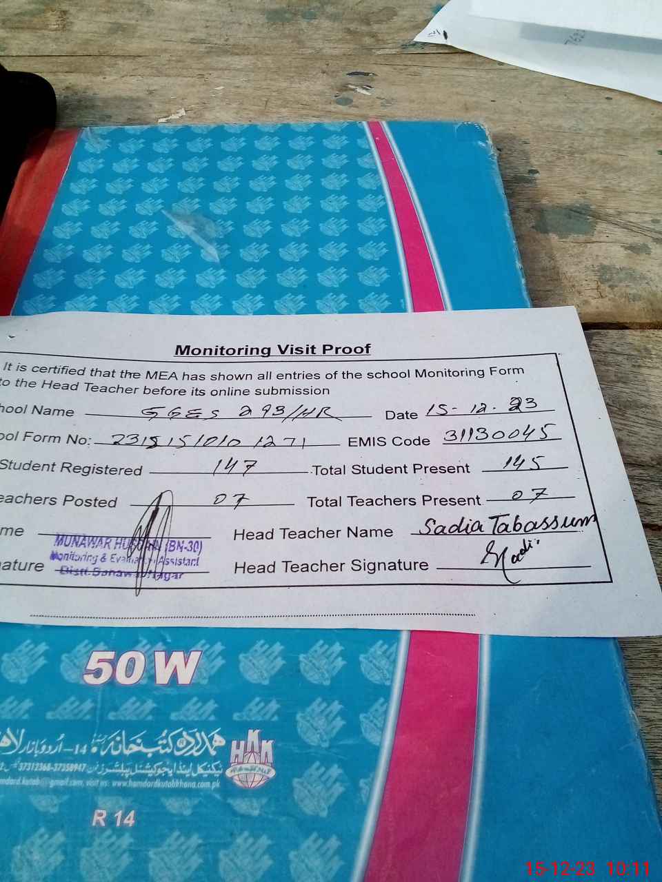 | Attendance Register | Head Teacher | MEA with School | Visit Proof |